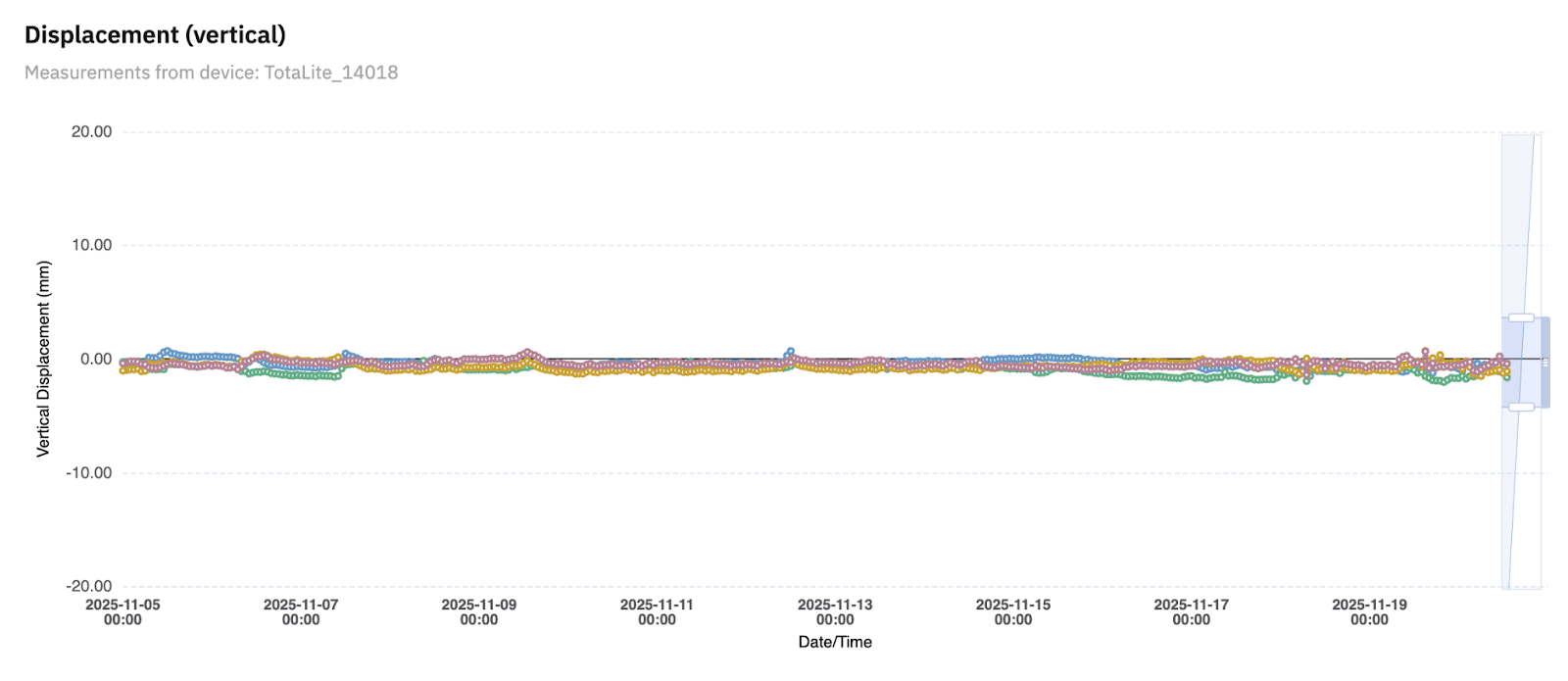 On the existing crane, the answer was reassuring. Movements stayed well below the 18 mm threshold Enigmatix had set. During lifts, the bases showed expected millimetric displacements and nothing else. No drift, no concerning trends. A crane operating on weak soils, operating safely, with the data to prove it.