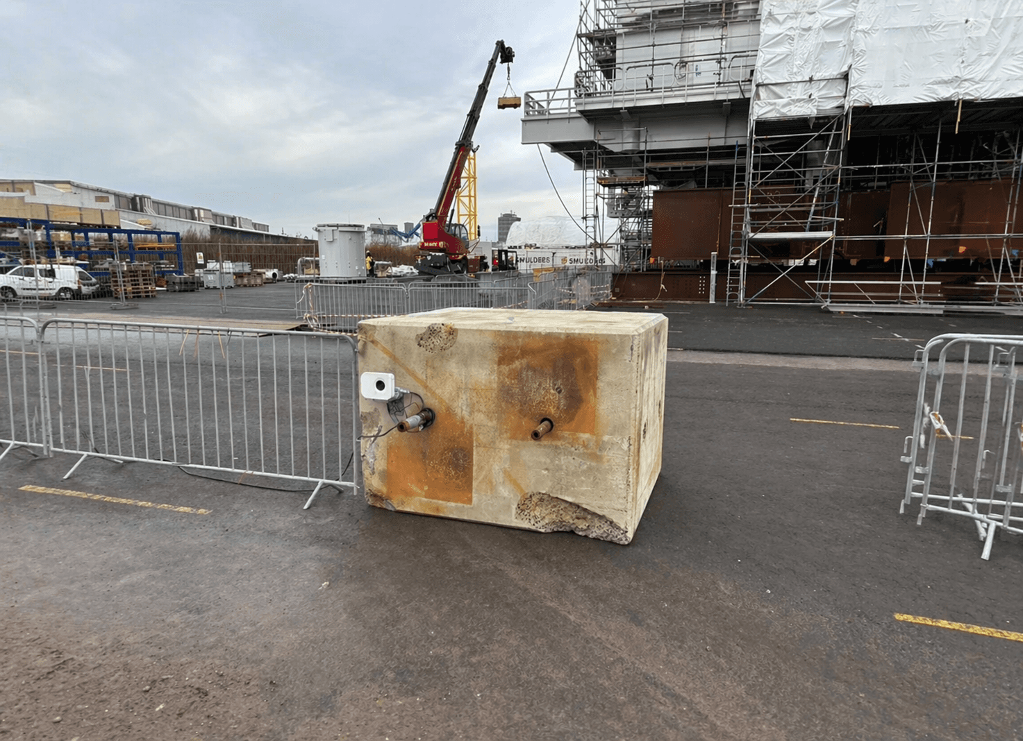 The installation was simple. The TotaLite device went onto a concrete block roughly ten metres from the crane. Prisms went on all four crane bases. No separate reference point was needed, the concrete block itself was stable enough to serve as one.