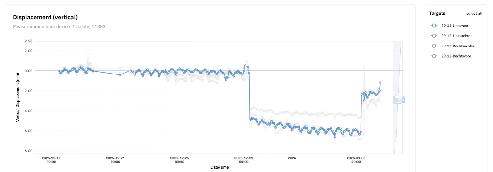 For the load test on the new crane, the setup was repeated. Monitoring started two weeks ahead of the test to establish a baseline and capture how the subsoil behaved when no load was present. The test itself ran for 14 days and afterwards, the sensor stayed on site a further two days to capture any residual settlement once the weight was lifted.