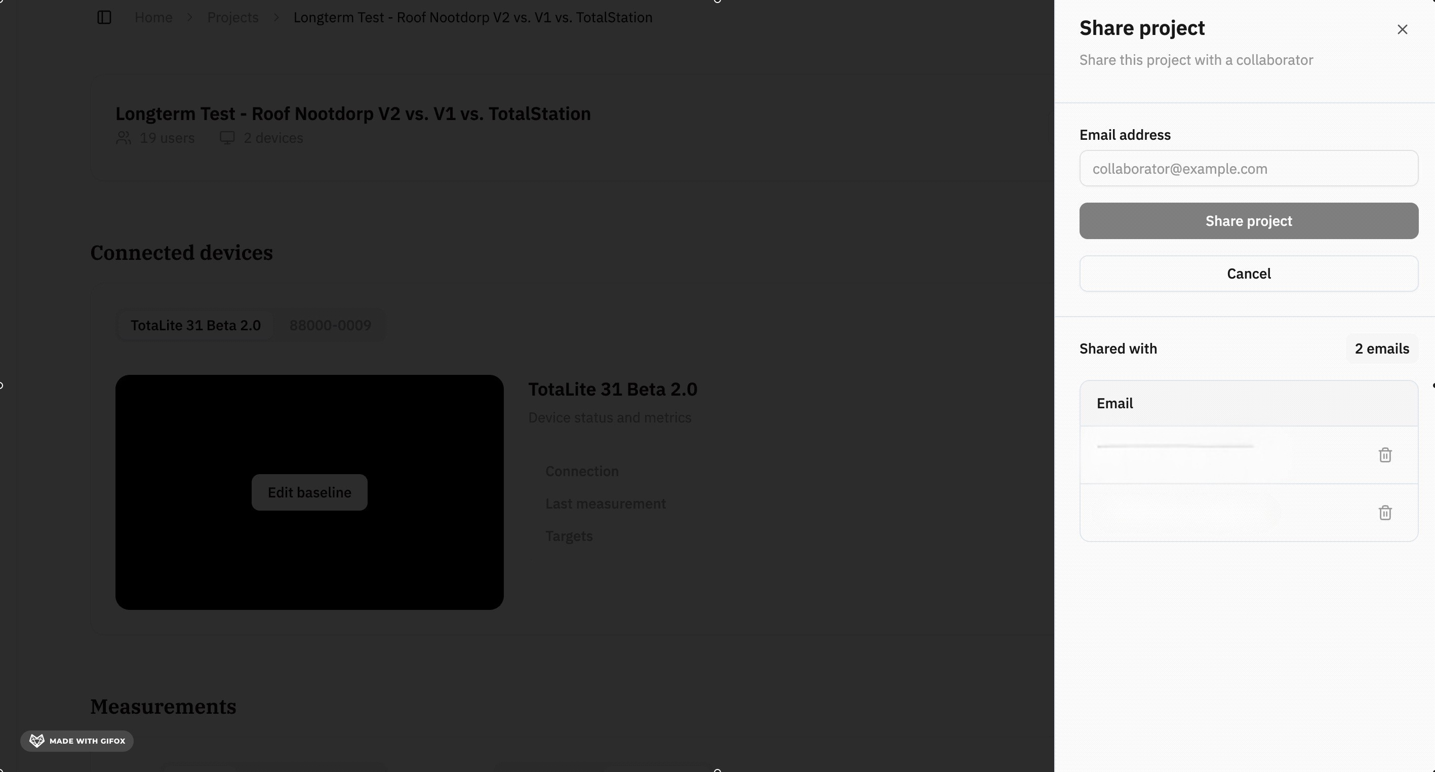 You can now share a project with people outside your company directly from the project screen. Hit the Share Project button and they’ll get view-only access to the project data. They can see everything, but can’t change project settings or touch device configuration. If you need to give someone within your business access, just add them to the project and company as usual.